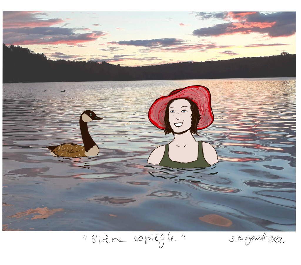 La talentueuse artiste a capté l’essence d’une nature intérieure en dessinant l’outarde et la « sirène espiègle » sur une photo que j’avais prise du lac. Dans cette oeuvre, elle a su insuffler de la Vie à la Vie. Quelle harmonie dans le choix des couleurs, les formes, et les personnages qu’elle a conçus! Un grand merci, chère amie artiste XXX