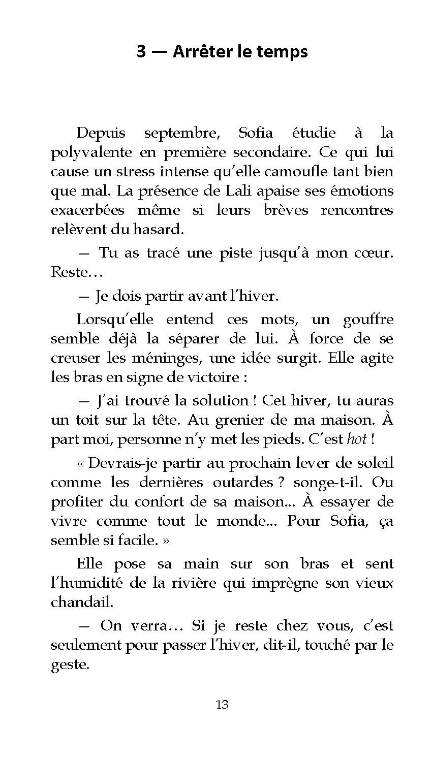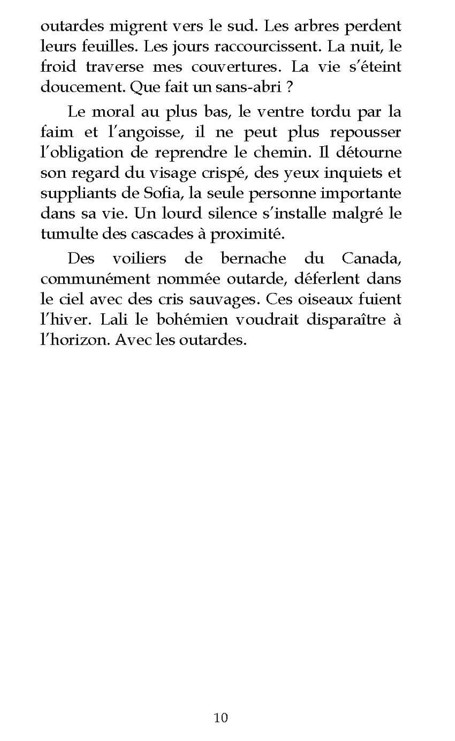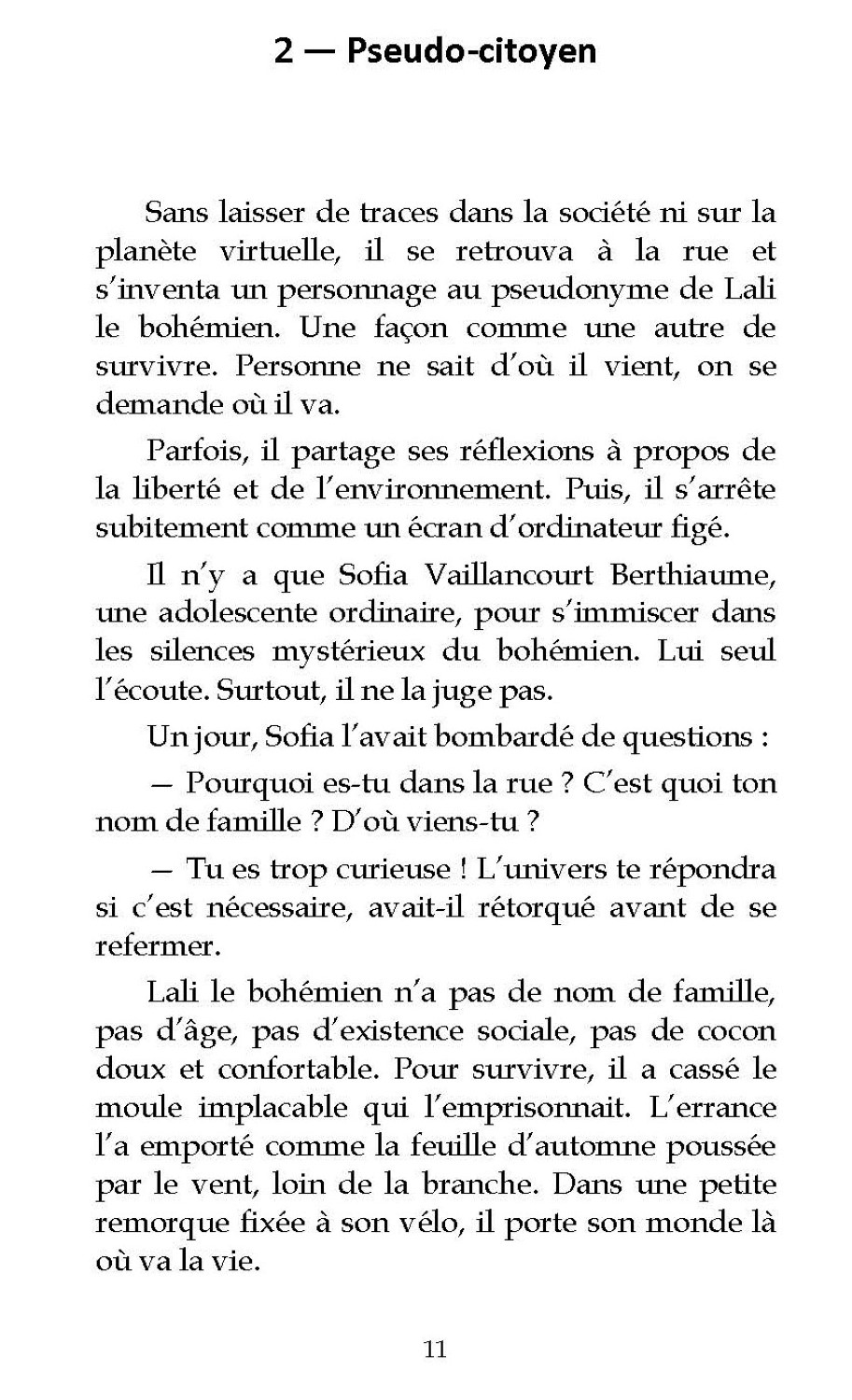 « Sans laisser de traces dans la société ni sur la planète virtuelle, il se retrouve à la rue et s’invente un personnage au pseudonyme de Lali le bohémien. Une façon comme une autre de survivre. Personne ne sait d’où il vient, on se demande où il va. Il n’y a que Sofia Vaillancourt Berthiaume pour s’immiscer dans les silences mystérieux du bohémien. Lui seul l’écoute. Surtout, il ne la juge pas… »