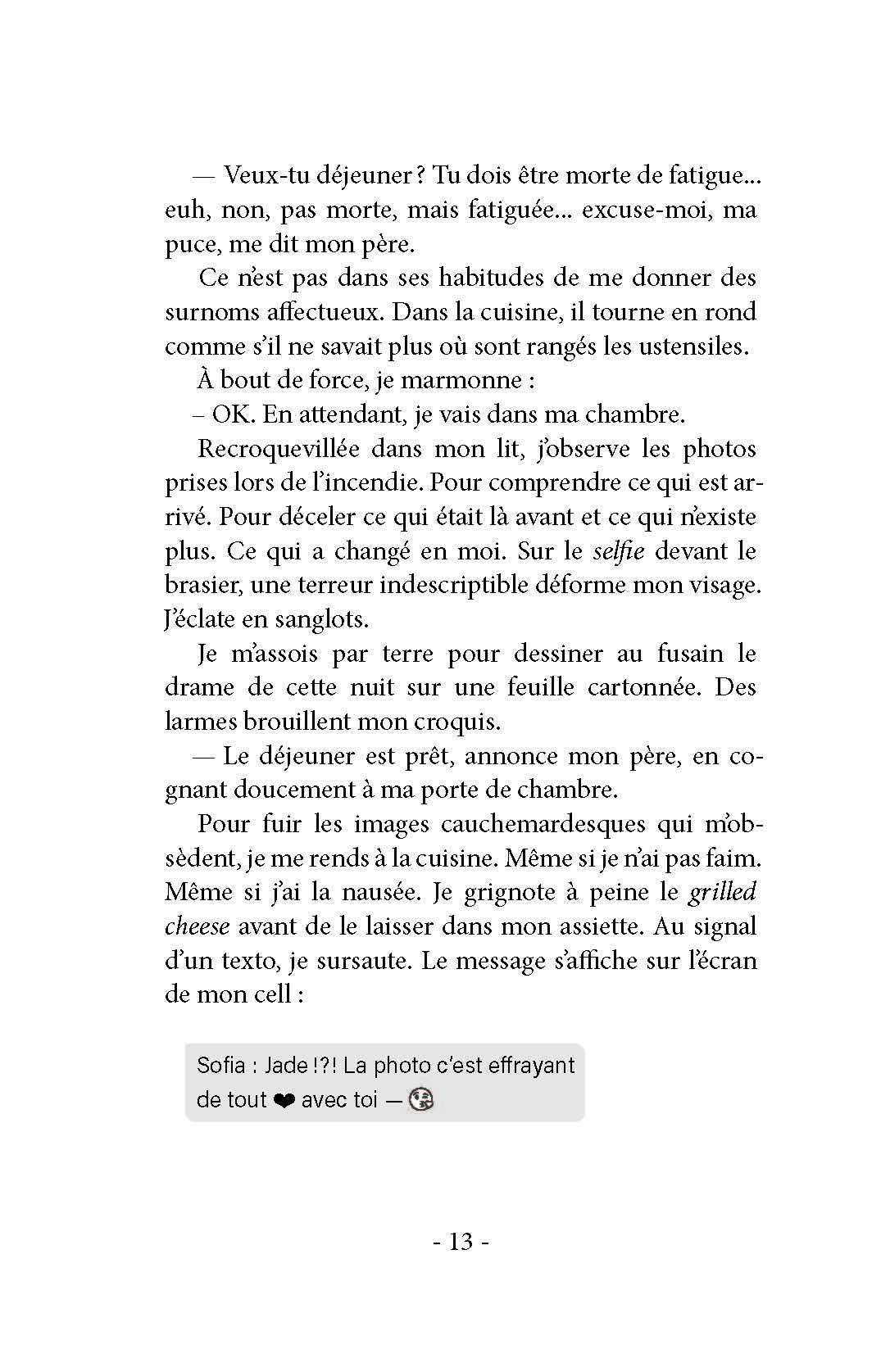 Divers thèmes traités dans les romans pour adolescents sont présents dans ce texte bien écrit et sans digressions inutiles. Il aurait pu cependant être moins truffé de rebondissements – trahison, intimidation, agressions – quitte à publier une suite. Car à la fin, la réhabilitation de Jade se fait à un rythme peu probable.