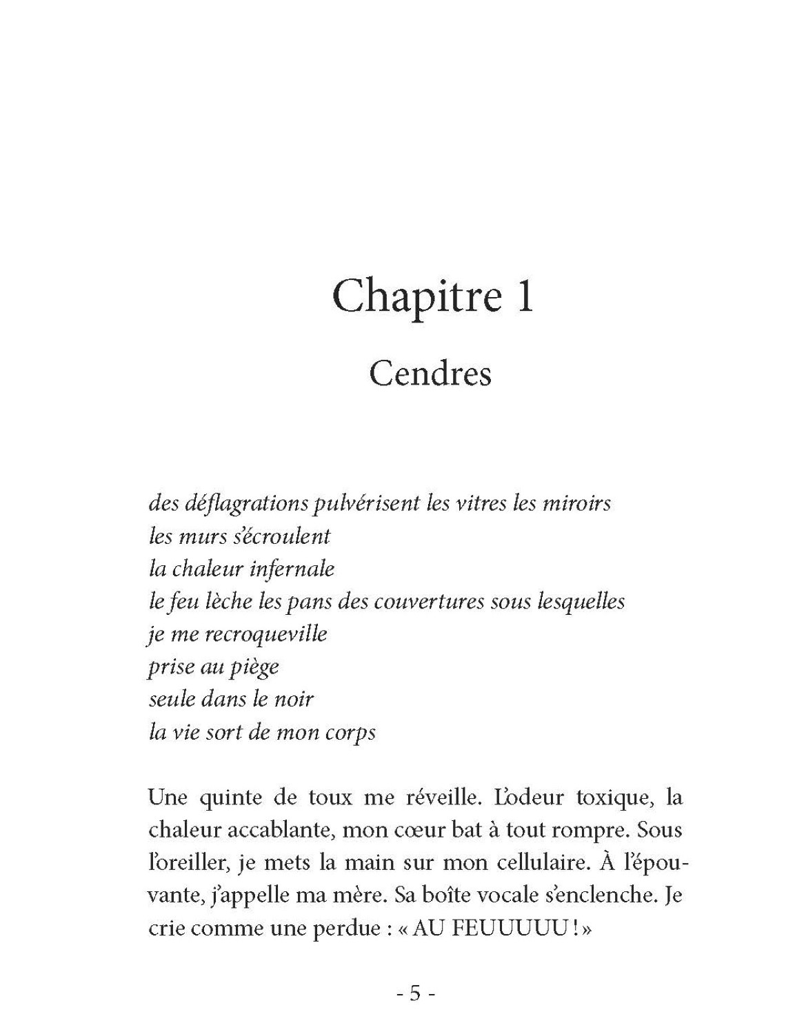 / Je me sens minuscule et insignifiante comme un grain de sable perdu dans le désert. / Mes photos se multiplient à l’infini, semblables à des constellations. / Mon abdomen ressemble à un astéroïde sur le point d’exploser. / La rivière dévale devant moi comme si elle voulait m’entraîner dans sa fuite. / Le temps de le dire, je coule dans le sommeil comme une pierre dans l’eau. /