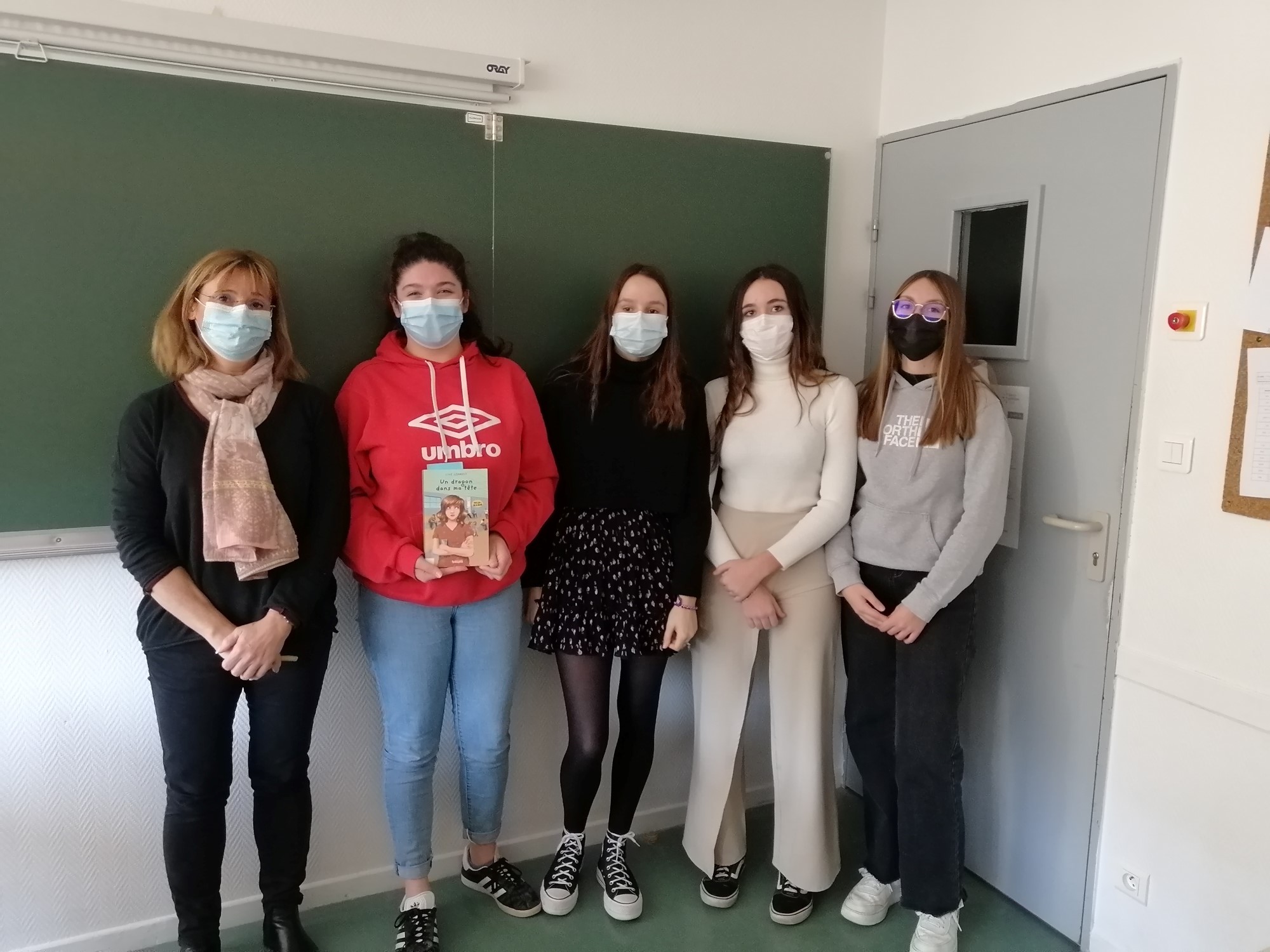 L’enseignante et des étudiantes du lycée de Bahuet (France) / Un dragon dans ma tête dans la biblio du lycée